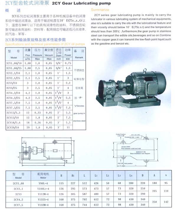 2CY系列齒輪潤滑泵主要用于各種機械設備中的潤滑系統中輸送潤滑油,適用于輔送粘度在10°E(75c,s.t)以下,溫度在300℃以下的具有潤滑性的油料,不銹鋼齒輪泵可輸送食用油料、飲料等:配用銅齒可輸送低閃點液體如汽油、笨等。